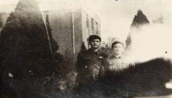 笔者(左)和同乡同学王德全在上基础课时于解剖楼前合影