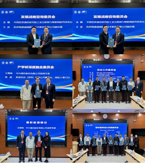 邵金友、梁莉、王伟分别为“四委会”委员代表颁发聘书,同时为新聘任的兼职教授颁发聘书。受聘委员和兼职教授来自中国信息通信研究院、杭州海康威视、中兴通讯、中金公司、炬星科技等知名机构和企业,以及西安电子科技大学、西安工程大学等高校。发展战略咨询委员会委员金键、王滨,学校兼职教授、产学研深度融合委员会委员王继刚,青年教师成长发展委员会委员代表,以及校友工作委员会委员王月超、何翔、崔斌、李瑞、王蒙、范志超等出席仪式。