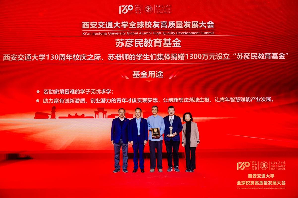 西安交大党委常委、宣传部部长、统战部部长成进,电气学院党委书记梁得亮,电气学院教授苏彦民,学子代表白小青、韩晓梅、卢家林、孟永庆为“苏彦民教育基金”揭牌。