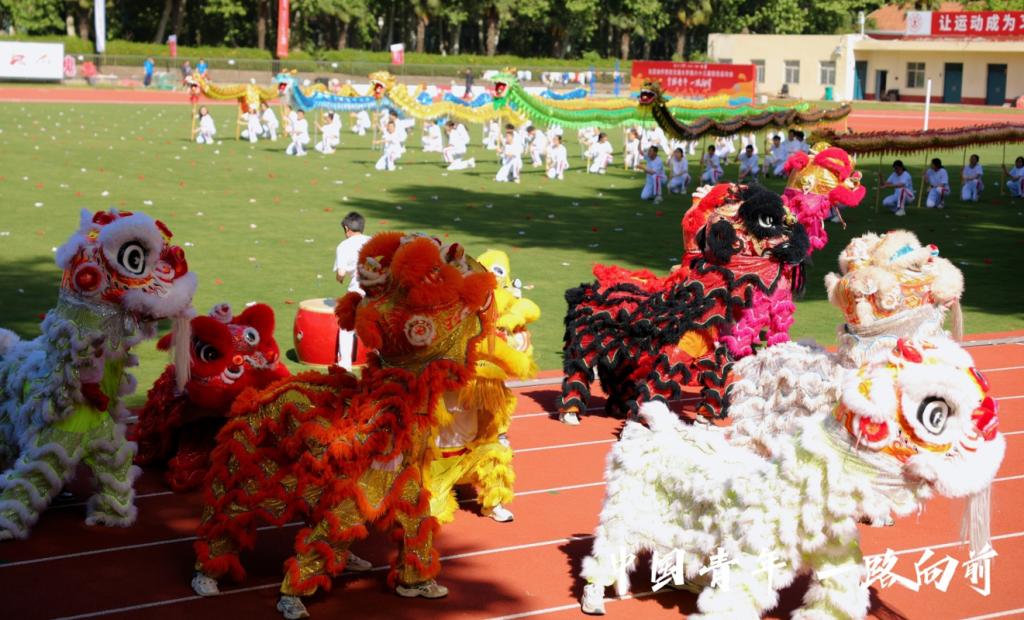 第四篇章《龙腾狮跃 起势凌云》,长龙蜿蜒翻腾,雄狮跳跃灵动,队员们动作配合默契。点睛仪式寓意吉祥,紧接着,祥龙瑞狮衔来一副精心撰写的对联,现场师生掌声不断,喝彩声此起彼伏。