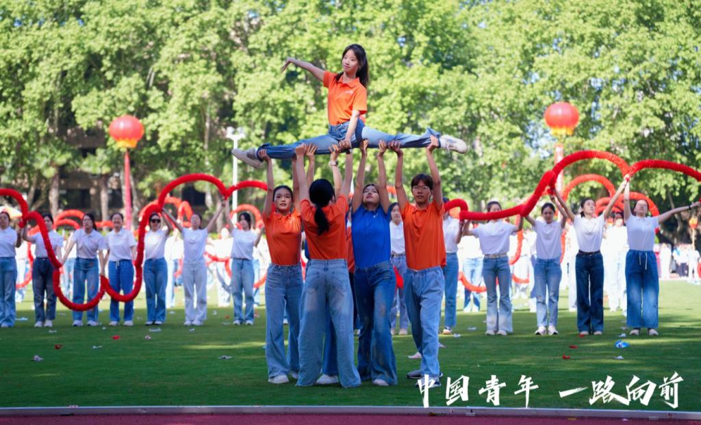 第三篇章《薪火相传 未来我来》中,艺术体操方阵的队员们身着统一服装,手持彩色花环,动作舒展流畅。随着音乐节奏不断变换队形,整体编排整齐有序。花环在手中交替起落,队形聚散之间层次分明。表演接近尾声时,方阵巧妙排列出“130”三个数字,造型清晰醒目。全体队员以这一方式向百卅交大送上真挚祝福。