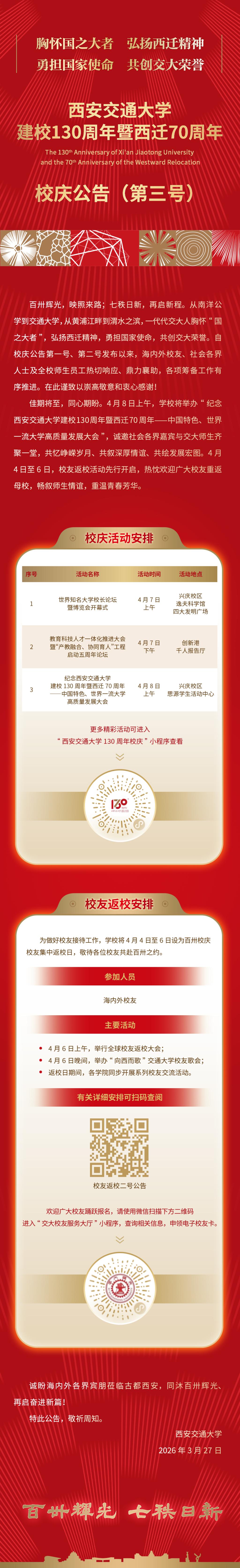 2026-03-27西安交通大学建校130周年暨西迁70周年校庆公告(第三号)内容来源:西安交大新闻网文字:校庆工作办公室图片:校庆工作办公