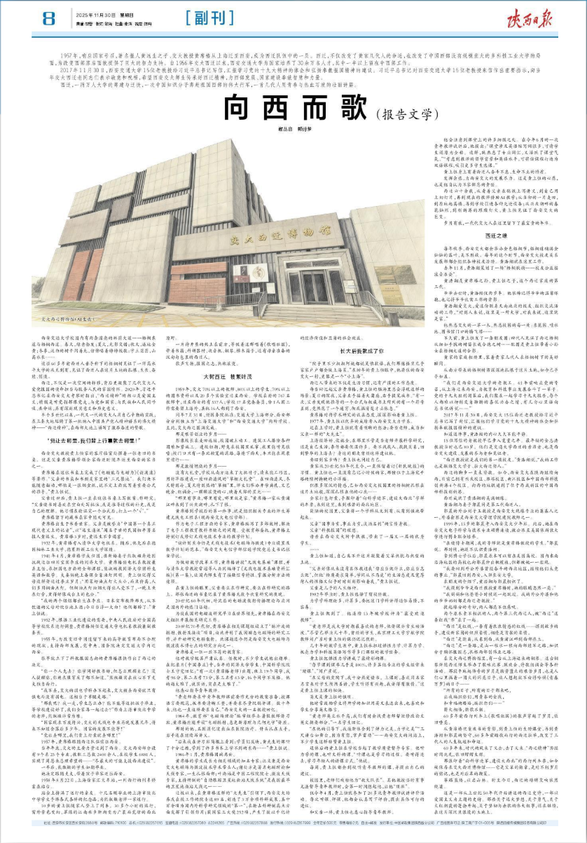 2025-11-301957年,响应国家号召,著名报人黄远生之子、交大教授黄席椿从上海迁至西安,成为西迁队伍中的一员。西迁,不仅改变了黄家几代人的命运,也改变了中国西部没有规模宏大的多科性工业大学的局面,为改变西部落后面貌提供了巨大的智力支持。自1956年交大西迁以来,西安交通大学为国家培养了30余万名人才,其中一半以上留在中西部工作。2017年11月30日,西安交通大...