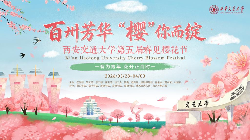 西安交大第五届春见樱花节浪漫开启new!2026-03-273月28日至4月3日,西安交通大学第五届春见樱花节将在兴庆校区、雁塔校区、中国西部科技创新港同步浪漫开启。花满枝,春正好。樱花纷飞处,邀你共赏繁花,同庆百卅芳华。PART1 主题景观:樱落成景 处处皆诗樱花是春天的信笺,也是百卅交大的请柬。从“欢迎回家”到“樱绽芳华”,八处樱花景观位于校园各处,以花为媒,以景寄情,让我们一起漫步其...